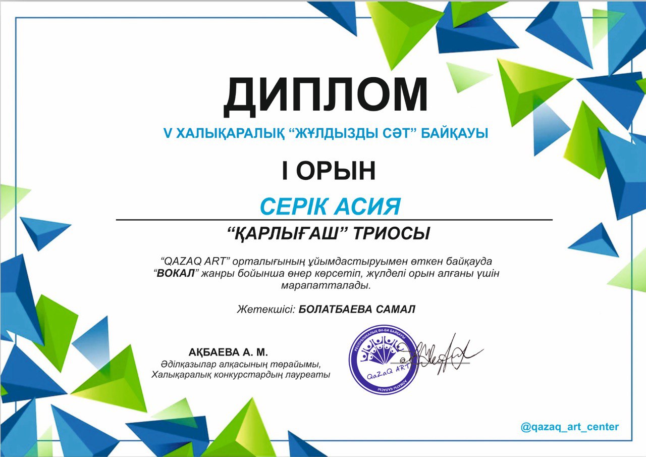 • "QAZAQ ART" орталығының ұйымдастыруымен өткен V Халықаралық "Жұлдызды сәт" байқауына "вокал"