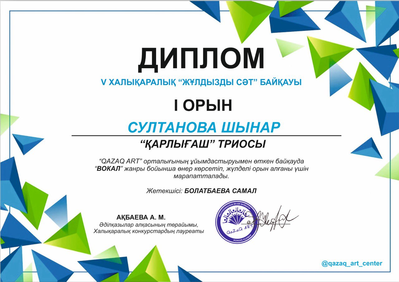"QAZAQ ART" орталығының ұйымдастыруымен өткен V Халықаралық "Жұлдызды сәт" байқауына "вокал" номинациясы бойынша қатысқан "Күншуақ" тобының бүлдіршіндері Итешбаева Ханшайым,Сұлтанова Шынар, Серік Асия жүлделі 🥇орынға ие болды.Жетекшісі Болатбаева С.Б.